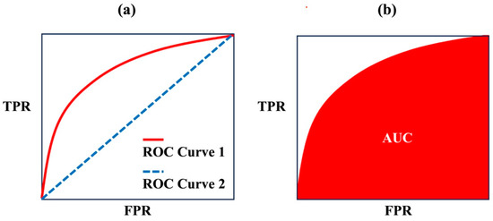 The FPR is the ratio of false positive values to the total actual negative values (Equation (11)). The TPR is the ratio of true positive values to the total actual positive values (Equation (12)). The TPR is ultimately the same as the recall. The ROC curve is created on the horizontal axis as the FPR and the vertical axis as the TPR (Figure 5). The ROC curve is created by plotting FPR and TPR depending on different thresholded values for classification. As depicted in Figure 5a, the diagonal blue dot line is lined by randomly predicting outcomes. The red line is placed over the blue dot line. This indicates that the predictive model of the red line achieved better than the chance level performances. The AUC is the area under the ROC curve, and the values of the AUC fall between 0 and 1 (Figure 5b). A value close to 1 signals good predictive performance.