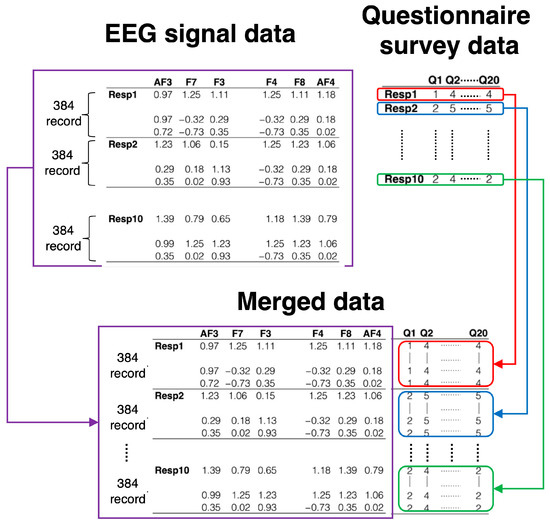EEG and questionnaire survey data were merged into a single dataset (Figure 6). However, because the two datasets had different numbers of rows, the empty fields in the questionnaire survey data were filled with the same values in the first-row data for each participant. Eventually, the dataset for the analysis contained 3840 rows and 34 columns, excluding the column of respondents.