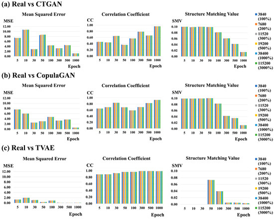 where is an element of the correlation coefficient matrix in the generated synthetic data, is an element of the correlation coefficient matrix in the real data, and N denotes the number of variables. Consequently, if the MSE is small, the CC is high, and the SMV is low, the generated data can be sufficiently close to the real data.