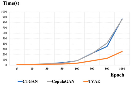 According to the increasing number of epochs, both GAN-based synthesizers (CTGAN and CopulaGAN) required much more computation time than the TVAE; however, there were minor differences in the calculation time between those GAN-based synthesizers and TVAE during shorter epochs (Figure 8, Table 2 and Table S6). When conducting a predictive analysis concerning real data, all predictive performances (accuracy, AUC, precision, recall, and F1 score) were 1.0. Therefore, regardless of the generated sample size, the predictive performances of the synthetic data generated using the trained models over 500 epochs were similar to those using real data. However, high volatilities in predictive performance were observed during shorter epochs (<100 epochs) in all generative models.