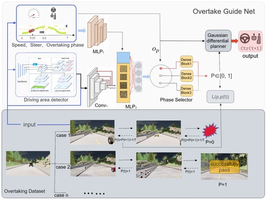 The structure of the neural network is shown in Table 1. The safety of overtaking maneuvers may be substantial when the autonomous vehicle (AV) is still in the original lane and there are preceding vehicles. However, if there is a vehicle not far ahead after entering the opposite lane, the likelihood of a successful overtaking becomes almost zero. To mitigate the influence of similar image features on decision making, this study introduced the Phase Selector (PS) in the feature analysis stage after feature fusion. The selection of network branches is determined by incorporating the current overtaking phase parameter, guided by , to generate the probability of safe overtaking in the current phase, denoted as :