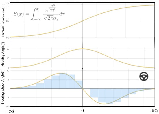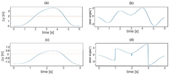 where is a hyperparameter, which is a number close to 0. If is too large, it could result in the vehicle not making smooth turns at the beginning and end of the overtaking maneuver, and it could also amplify the yaw angle error caused by differential operations. On the other hand, if is too small, it might lead to a delay in transitioning to the opposite lane after receiving the overtaking signal, potentially causing a missed opportunity for optimal overtaking. When t is equal to , the vehicle has occupied the opposite lane and complete the lane change. is a hyperparameter that is utilized to control the range of lateral displacement in the transition lane. After putting Equation (2) into and calculating its second-order derivative, the output value theta is the rotation angle s of the steering wheel at this moment, as shown in Equation (4).