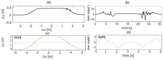 - Smoothness analysis. Traditional path planning involves first planning trajectory points and then executing trajectory tracking control. This approach offers the advantage of better robustness during the planning process, making it suitable for most autonomous driving scenarios. However, the scenarios addressed in this experiment involved relatively straightforward route options, encompassing only three situations: following a vehicle, overtaking, and returning to the original lane when danger is detected. The results of the experiment indicated that employing a method that directly plans control signals with varying maximum lateral displacements can effectively complete these tasks. This approach not only reduces the computational complexity but also ensures the smoothness of both the trajectory and control signals, ultimately enhancing passenger comfort. Huang et al. [4] built an overtaking environment with a mini car and recorded the overtaking track and the steering wheel angle signal. As one of the rare approaches that utilize common function curves for overtaking trajectory planning, our method was compared to the abovementioned method, and the trajectory outcomes are illustrated in Figure 5. Assuming that the speeds of the leading vehicle and the ego vehicle were constant, and using the geometric curve to plan the overtaking path, the route planned by the model in this paper was smoother, and the fluctuation of the control signal was not severe. This was because Huang et al.’s solution was to plan the trajectory first and then use the PID algorithm to restore the planned trajectory as much as possible. Our solution was to directly calculate the executed control signal based on the derivative of each key point of the target curve, so that both the control signal and the trajectory looked smoother.