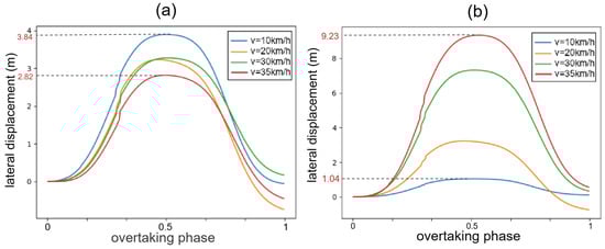Figure 7. Variation in lateral displacement during overtaking phase at different speeds. (a) shows the displacement change introduced by . (b) shows the displacement change without .