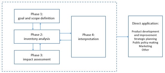 Life cycle assessment is a quantitative methodology used to evaluate the environmental impact of systems or services, and it is used in different fields related to a process and a product (policy, marketing, design, etc.). Life cycle assessment takes into consideration the energy and material balances that a process exchanges with the environment, and it is standardized by the ISO. As reported in Figure 2, this methodology is composed of four phases, regulated by ISO 14040 [59] and ISO 14044 [60]. These phases are interdependent and are goal and scope definition, life cycle inventory analysis (LCI), life cycle impact assessment (LCIA), and interpretation phase.