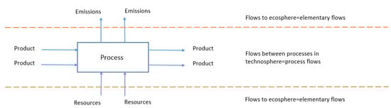 In addition to satisfying the above questions, the system boundaries of the analyzed system and functional unit are defined in this phase. System boundaries separate the technosphere from the ecosphere and border all processes considered in the life cycle analysis. Among the mentioned areas, the technosphere contains all analyzed and considered processes while the ecosphere is related to the environment. The interaction between the ecosphere and the technosphere is described by elementary flows (emissions and resources). On the other hand, flows inside the technosphere and between processes are called process flows or economy flows (valuable products or unwanted wastes) [63] From these considerations, it is evident that elementary flows are the inputs and outputs of the system boundaries, while process flows are inside the system boundaries, as shown in Figure 3. To be more precise, ISO 14040 says that elementary flows are in the input and output of “the analyzed system without previous or succeeding human transformations” (ISO 14040, ISO 14044).