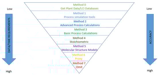In the life cycle inventory analysis, an inventory of all input (such as material, energy, resource flows) and output (such as product, waste to treatment, emission flows) data for all processes inside the system boundaries is set and as a result, a list of elementary flows (resources and emissions) is provided. Generally, process data are protected by companies; then, other different methods can be used, with differences in accuracy and data/time requirements (time is an important parameter because it is necessary to reduce the time to complete a life cycle assessment) as reported in Figure 4. Here, in addition to real plant data, the following sources can be used: database (method 0), process simulation tools (method 1), advanced process calculations (method 2), basic process calculations (method 3), stoichiometry (method 4), molecular structure models (method 5), and proxy data (method 6). In some cases, data can be omitted (method 7).