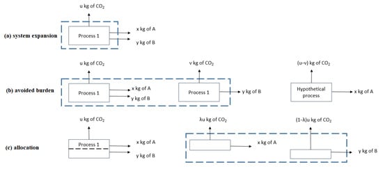 Suggested methodologies for co-products in the life cycle assessment analysis: (a) system expansion with the environmental impact of u kg of CO2 for x kg of A and y kg of B; (b) avoided burden with the environmental impact of (u−) kg of CO2 for x kg of A; (c) allocation with the environmental impact of u kg of CO2 for y kg of B. [Modified after von der Aßen [62]].