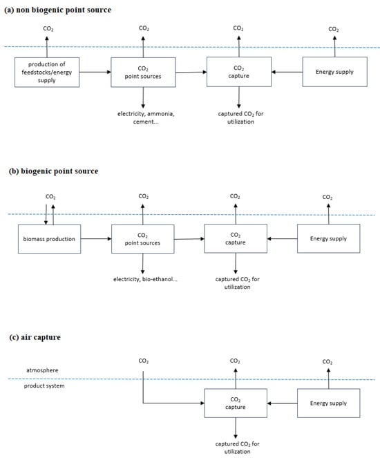 Classification of carbon dioxide sources: (a) carbon dioxide capture from non-biogenic point sources includes capture from power plants and industrial processes; (b) carbon dioxide from biogenic point sources includes biomass production; (c) carbon dioxide capture from ambient air [Modified after von der Aßen [62]].