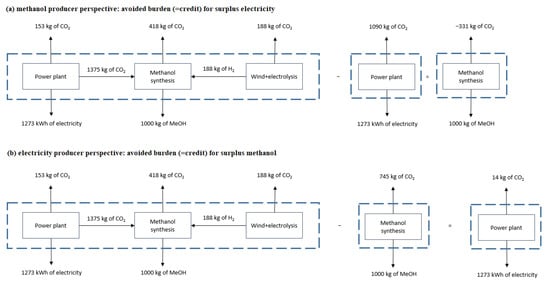For a product-specific analysis, with the avoided burden applied to the considered supply chain, Figure 8 can be considered, where two products such as electricity (1273 kW) and methanol (1000 kg) are present. The main function of the system can be either electricity (considering the electricity producer point of view), as in Figure 7b, or methanol (considering the methanol producer point of view), as in Figure 7a.