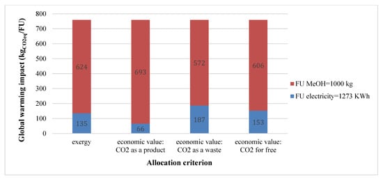 The allocation methodology can be developed according to exergy and economic criteria, and results are reported in Figure 9 for the considered carbon supply chain. If methanol is the functional unit, the environmental impact is 135, 66, 187, and 153 kgCO2eq, respectively, for an exergy allocation, an economic allocation where carbon dioxide has a value as a product, as waste, or if it is for free. On the other hand, if electricity is the functional unit, the environmental impact is 624, 693, 572, and 606 kgCO2eq, respectively, for an exergy allocation, an economic allocation where carbon dioxide has a value as a product, as waste, or if it is for free.