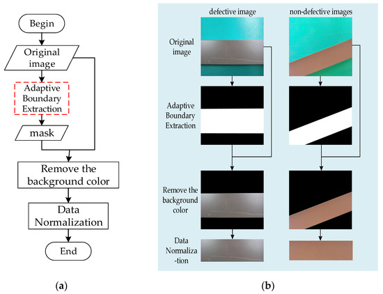 Aluminum profile image preprocessing algorithm. (a) Aluminum profile image preprocessing algorithm flowchart; (b) schematic diagram of the aluminum profile image preprocessing algorithm.