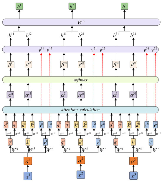 The working principle of the multi-head attention mechanism is shown in Figure 7 for a 2-head attention model.