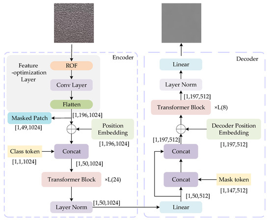 Differing from the above method, this paper integrates the feature-optimization module into the MAE model, which on the one hand reduces the redundant data, reduces the model reconstruction time, and makes the model reconstruction faster and more accurate, and, on the other hand, eliminates the negative impact of the complex texture of the aluminum profile’s surface that is irregularly distributed for the reconstruction process. Through the above method, we can improve the Structural Similarity Index Measure (SSIM) of the aluminum profile image before and after reconstruction, and then effectively determine whether the input image has defects.