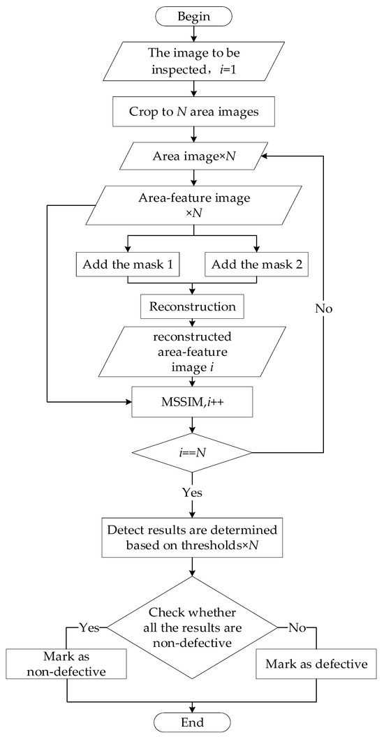 - Surface-defect detection: Firstly, the image to be detected is adaptively preprocessed to get the aluminum profile image with uniform specifications. Then it is cropped to obtain all of the area images, and the area images are input into the model one by one. The feature-reconstructed image is then compared with the area-feature image by mean structural similarity index measure (MSSIM) comparison to determine whether the input image is a defective image. Finally, the detection results of all area images of the image to be detected are used to determine the final detection results.