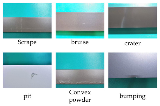 In recent years, with the intensification of global economic competition, many countries have been actively promoting the “Industry 4.0” strategy, which aims to accelerate the development of digitalization, intelligence, and automation in the manufacturing industry in order to improve the competitiveness of national manufacturing industries. As an industrial base material, aluminum profiles are widely used in many fields such as power equipment, mechanical equipment, aerospace, infrastructure construction, and transportation, and are favored for their design flexibility, hardness, light weight, and wear resistance. However, constrained by production equipment and environmental conditions, aluminum profiles can hardly avoid surface defects, such as coating cracking, orange peel, bumping, convex powder, bubbles, and dirty spots, during the manufacturing process. These defects directly affect the quality, appearance, and safety of aluminum profiles. Especially in high-risk industries (e.g., aerospace and transportation), surface defects of aluminum profiles may lead to equipment failures and accidents, posing a serious threat to the safety of life and property. Therefore, determining how to efficiently and accurately detect defects on the surface of aluminum profiles is of great academic and practical significance. Currently, manual inspection is still the main method for the detection of aluminum profile surface defects. Although the method has a certain accuracy, it takes a lot of time and manpower and is easily affected by the subjective judgment and fatigue of staff, such that efficiency and reliability are limited. In addition, as the production speed of aluminum profiles increases, manual inspection can no longer meet the production line’s demand for inspection speed. Therefore, there is an urgent need to replace inefficient manual work by intelligent means.