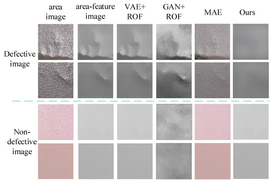 In order to evaluate the performance of the surface-defect detection method for aluminum profiles described in this paper, in this section, the detection method is compared with three unsupervised detection methods, namely, Masked Auto-Encoders (MAE), Variational Auto-Encoders (VAE) incorporating feature-optimization methods (VAE + ROF), and the Generative Adversarial Network (GAN) incorporating feature-optimization methods (GAN + ROF).