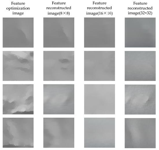 In Section 3.2.3 we mentioned that when a 224 × 224 image is fed into the essential features extraction network, it is divided into 16 × 16 blocks at the feature-optimization layer, but we also tried dividing it into 32 × 32 blocks and 8 × 8 blocks and comparing the results obtained in these cases. Figure 20 shows an example of the reconstruction results from the model for the feature-optimized image in these three blocking scenarios.