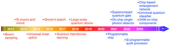 Advancement and milestones reached in the field in the last decade. The achievements until 2018 are partially taken from Ref. [20] (red fonts). Starting from 2013, the following results and milestones have been achieved: demonstrations of boson sampling with multiple photons [34,35,36,37,38]; the first integration of spontaneous four-wave mixing sources with quantum circuits [33]; demonstration of universal linear-optic circuit [39]; test of Grover’s search algorithm [40]; test of quantum-Hamiltonian-learning algorithm [41]; large-scale quantum circuits in silicon [42]; programmable chip [43]; supercompact quantum gate [44]; on-chip single-photon detector [16]; silicon programmable qudit processor [45]; chip-based entanglement network [46]; universal quantum classifier [47]; and photonic circuit with 2446 components [48].