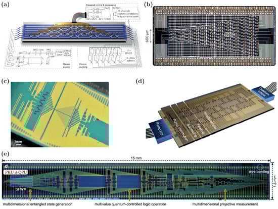 A photonic quantum chip with 95 phase shifters and 355 optical components was realized by Chen et al. [55]. This chip represented a platform on which to study the quantum superposition of coherent multimode states—in particular, a generalized multipath wave–particle duality. The transition between the full-particle nature and full-wave nature was obtained for a classical mixture and a quantum superposition. One year later, the same group presented an advanced chip a quantum processing unit [45], that integrated all the necessary components to initialize, manipulate, and measure quantum-quart (ququart) states. It was composed of 451 photonic components, including 116 reconfigurable phase shifters, which could be directly addressed and controlled by using the co-integration technology of photonic and electronic circuits in silicon [see Figure 2e]. The authors proved that quantum computation based on a qudit of dimension d, together with integrated photonics, can increase quantum parallelism with reference to computational accuracy, capacity, and efficiency, compared to its counterpart of quantum computing based on qubits. Specifically, the computational capacity of a four-qubit processor can be equivalently achieved by a two-ququart quantum processor. Encoding each qudit in a dimension d, keeping the same number of photons, improves the detection rate of photons. Furthermore, computational efficiency and speed-up are enhanced by multiple-path interference.