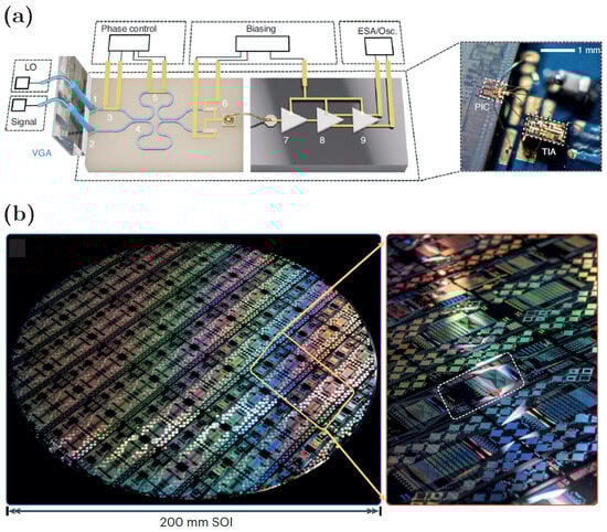 (a) Illustration and photograph of the homodyne detector device mounted onto a PCB [62]. From [62], Springer Nature. (b) Photograph for the quantum device of Ref. [48] in a 200 silicon-on-insulator wafer, fabricated by CMOS processes. The white dashed box refers to a single copy of the device. Panel reproduced from Ref. [48], under a Creative Commons license (https://creativecommons.org/licenses/by/4.0/, accessed on 28 July 2023).