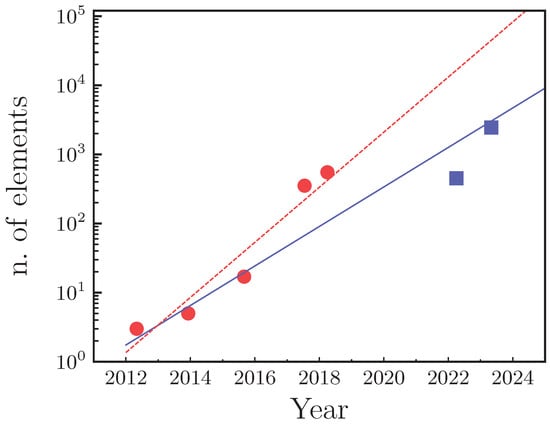 Evolution of the number of components in photonic chips through the years. The red dots represent the number of integrated optical elements claimed in Refs. [33,42,52,72,73], already discussed in Ref. [20], and the red-dashed line indicates a double number of components every 9 months. The blue squares indicate the new results published in Refs. [45,48], which increase slightly the doubling time to approximately 13 months.