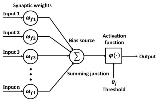 ANN consists, in most cases, of an input layer, at least one hidden layer (in the case of a simplified model), an output layer, the weight, the connection biases, the activation function, and the sum node. The layers in turn are made up of several connected units (called neurons) [], considered to be the fundamental building blocks for the correct functioning of a neural network. The link between neurons is achieved by so-called connecting links []. The basic diagram of a neuron is shown in Figure 1 [].
