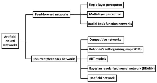 ANNs must be trained by feeding the network a set of quantified data to achieve the desired output using a pool of input data []. The learning process continues until the NN output matches the expected output []. The problem with ANN models lies precisely in overtraining, i.e., when the network capacity for training is too high or too many training iterations are allowed per network []. The degree of training accuracy obtained in the different applications where the ANN technique is used is very high, in the order of 10−5 to complete the training processes []. NNs can be grouped into different categories depending on their structure []. This classification is shown in Figure 2. The most commonly used are single-layer feed-forward networks, multilayer feed-forward networks, radial basis networks, and dynamic (differential) or recurrent neural networks. Of these, single-layer power supply networks are the best known and most widely used. Single-layer power supply networks were the first and simplest networks devised. Information travels in only one direction: from input nodes, through hidden nodes, to output nodes. This type of NN can be designed based on different unities, and among them, the perceptron is the most famous and simplest example []. Rosenblatt created the perceptron in 1958, thanks to the creation of the training algorithm []. The perceptron is composed of a single neuron with adjustable synaptic weights and thresholds []. The most frequently used algorithm is the so-called backpropagation (BP) algorithm []. The BP algorithm consists of training and correcting the weights until the error function is below the desired tolerance limit [].