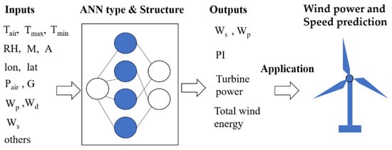 Figure 3 details the most common inputs and outputs used by ANNs in wind power and wind speed prediction and the operating scheme.