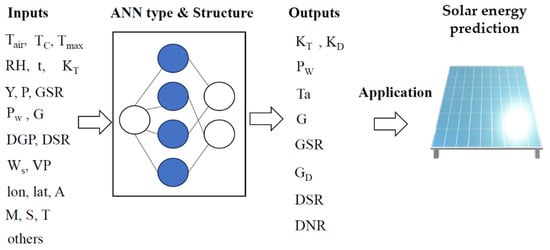 Figure 4 details the most common inputs and outputs used by ANNs in solar energy prediction and the operating scheme.