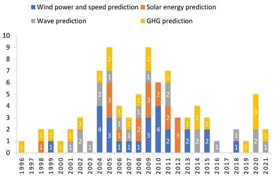 The review of the research articles revealed that the level of publications in relation to the three aspects analyzed was similar. Wind power and speed prediction generated 25 articles, very similar to the 24 articles for GHG prediction, followed by 20 articles on wave prediction and 17 on solar energy prediction. The first research article was published in 1996 and, except for 1997 and 2017, in every year until 2021, research was published on the topics analyzed.