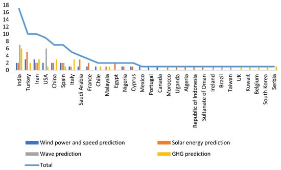 Research carried out by 30 countries has been published and interest in the subject extends to all continents. Figure 7 shows that the interest in the different research analyzed maintains a constant distribution. However, a special interest in wave prediction is observed in the USA as well as in India. This last country also stands out for the number of publications on GHG prediction. Turkey’s first place as the country with the highest number of publications on solar energy prediction is also particularly relevant.
