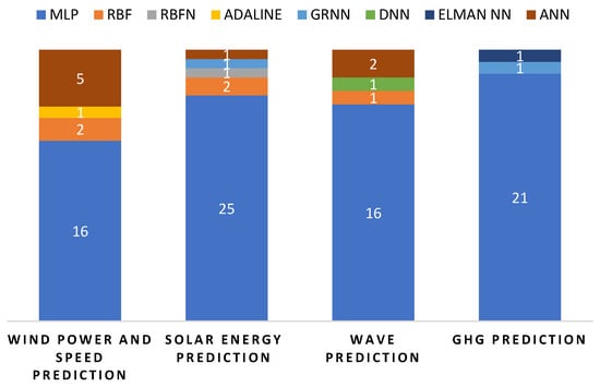 Figure 8 presents the different network structures used. Most of the investigations opted for MLP as the ANN type. The use of MLP is especially predominant in GHG prediction and solar energy prediction.