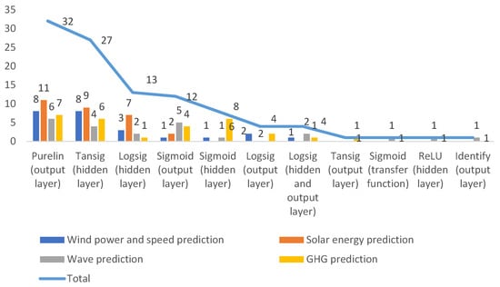 - Activation function: the activation function is specified in 15 out of the 20 research. In the hidden layer, linear functions are used, with tansig and logsig being the most commonly used, while in the output layer, linear functions of the purelin and sigmoid types are adopted.