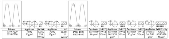 Figure 1 shows a schematic line for finishing boards with UV varnish products. In the first step of the process, the parts were sanded and then two layers of putty were applied. The first was cured with 1 mercury (Hg) lamp, while two Hg lamps were used to crosslink the second layer. The next operation was to sand the surface of the putty and apply the basecoat as two layers. Each layer was cured using two LED lamps. Some variants were prepared with three coats of basecoat. In the final step, a topcoat was applied and cured using two LED lamps and five mercury lamps. All operations were performed on the production line at a speed of 50 m/min at ambient temperature.