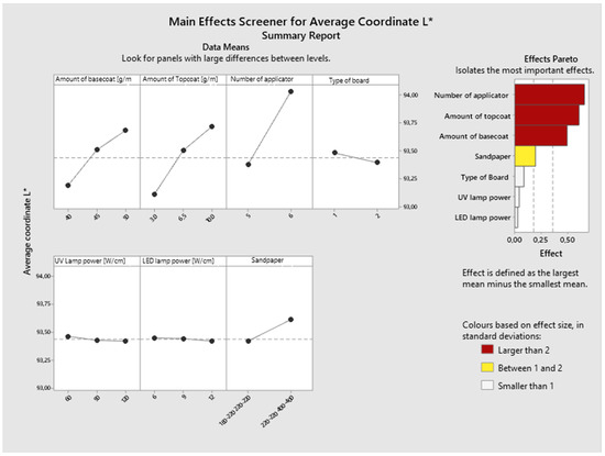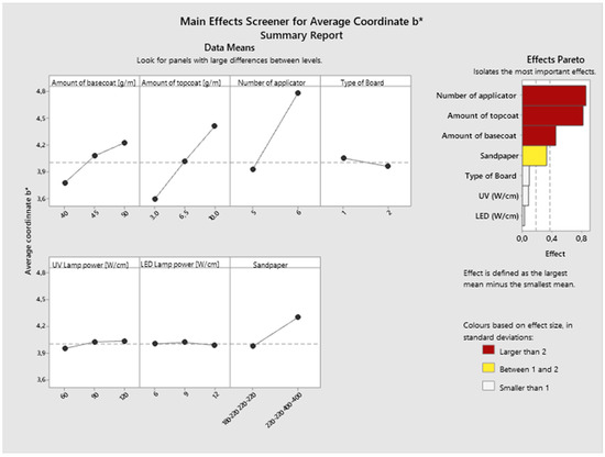 The results obtained were further statistically analysed. Figure 2 and Figure 3 show Pareto effect size plots in standard deviation for coordinates L* and b*. The most influential factors (larger than 2) were the number of applicators used and the amount of topcoat applied, followed by the amount of the basecoat applied. The sandpaper used was the factor in the intermediate importance group. Figure 2 also shows the main effect plot for the factors studied. Increasing the number of varnish applicators resulted in higher coordinates of L* and b*. An increase in brightness was noted during the increase in application when the topcoat and basecoat were applied. The finer the abrasive grit size (220–220 and 400–400), the higher the coating performance. The type of board was first in the group of factors with the least impact on L* and b*. Board A, with higher density, achieved higher brightness. For UV mercury and LED lamp power, the line is horizontal (parallel to the x-axis), so there was no main effect. Each level of the factor affected the response similarly, and the response mean was the same across all the factor levels.