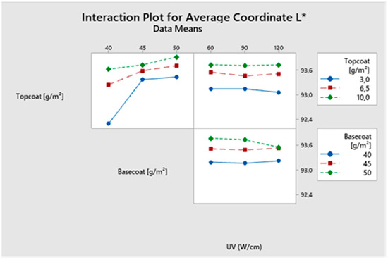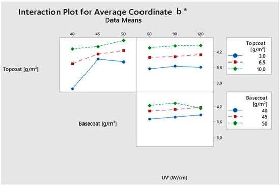 A Pareto analysis was carried out for L* and b* data to account for statistically significant interactions between factors. The results pointed out the following relations: the amount of basecoat–topcoat, basecoat–topcoat–UV mercury lamp power and basecoat–UV mercury lamp power. An interaction plot was then generated to visualize the interactions taking place (Figure 4 and Figure 5). In the case of topcoat–basecoat interaction, the coordinates L* and b* increased when the amount of topcoat and basecoat increased. The largest spread occurred when the smallest assumed amounts of topcoat (3 g/m2) and basecoat (40 g/m2) were applied. Moreover, analysing the mercury lamps’ power, it is possible to state that increasing the power resulted in a slight increase in L* and b*. The last significant interaction concerns the basecoat and mercury lamp power. The situation was analogous to that described previously, but it was surprising to see a decrease in both L* and b* when applying the largest amount of basecoat tested (50 g/m2) when cured with a lamp power of 120 W/cm. The results of this variant equated to those obtained for an application of 45 g/m2 and lamp power of 120 W/cm.