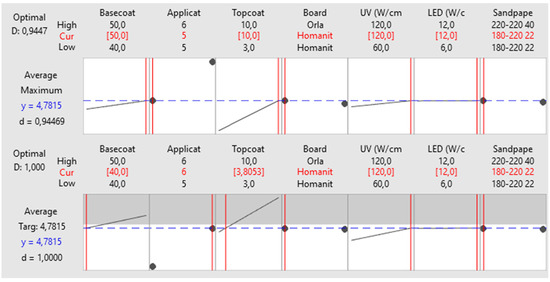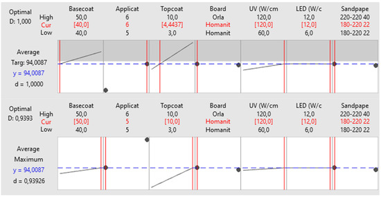 Factorial DOE analysis was carried out for L* and b* data, and optimization plots were generated (Figure 6 and Figure 7). The impact of each factor (columns) on responses or composite efficacy (rows) is shown. The vertical red lines in the graph represent the current ratio settings. The numbers at the top of the column show the current factor level settings (in red). The horizontal blue lines and numbers show the responses for the current factor level. Each impact of the factors on responses or overall desirability is displayed in columns and rows. The graph’s current factor settings are shown as vertical red lines. The current factor level settings are indicated (in red) by the numbers at the top of each column. The numbers and horizontal blue lines represent the replies for the current factor level. Based on the obtained data, it was estimated that by increasing the number of overlays in the process, a decrease of the basecoat spread rate from 50 g/m2 to 40 g/m2 and of the topcoat from 10 g/m2 to 4.4 g/m2 are allowed, when curing with the highest mercury lamp power of 120 W/cm and LED lamp power of 12 W/cm, while maintaining the same high level of coordinate L*. The same relationship applies to coordinate b*. To achieve a high coordinate b* = 4.7815, increasing the number of overlays from 5 to 6 is sufficient, thereby reducing the amount of basecoat applied by 10 g/m2 and topcoat by 6.2 g/m2.