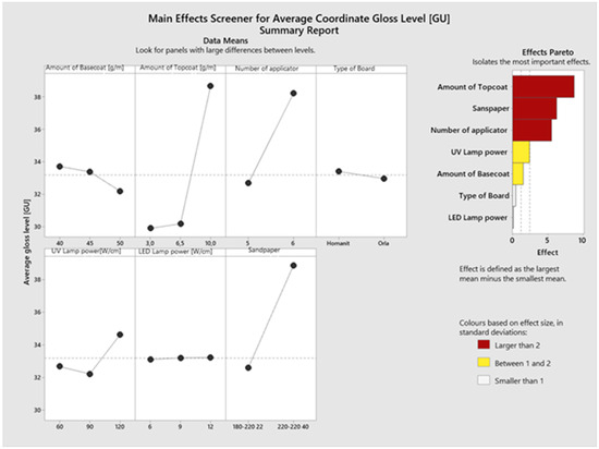 A Pareto effect size plot in standard deviation was determined for the gloss results (Figure 8). It was found that the amount of the applied topcoat, the abrasives used and the number of applicators had the greatest effect on the achieved surface gloss (effect size larger than two). The next two factors are UV mercury lamp power and the amount of the basecoat (between 1 and 2). The type of board and the LED lamp power did not affect this parameter. The main effect plots describe the gloss change direction under individual factors’ influence. Applying a topcoat at 3.0 and 6.5 g/m2 had no significant effect on the analysed ratio. An increase of a further 3.5 g/m2 resulted in a very sharp increase of almost 10 gloss level units. Using finer abrasive grit size and a greater number of applicators helped increase the recorded gloss values on the coating. Curing with mercury lamps in the intermediate power variant (90 W/cm) resulted in the lowest parameter, while the highest parameter was obtained for 120 W/cm. The gloss decreased as the amount of the basecoat increased. The higher-density HDF board achieved a slightly higher gloss level. The line is horizontal (parallel to the x-axis) for LED lamp power, so there was no main effect.