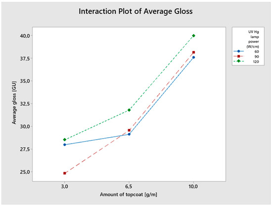 Analysing the Pareto chart of the standardized effects for interactions, the only statistically significant interaction was that between the amount of the topcoat applied and mercury lamp power (Figure 9). When 3 g/m2 of topcoat was applied, the gloss level was similar for the surfaces cured with mercury lamps at 60 W/cm and 120 W/cm. The lowest values were achieved at 90 W/cm. The gloss level increased by applying 6.5 g/m2, with the lowest increase recorded for curing with mercury lamps at 60 W/cm. The gloss increased as the lamps’ power increased. A further increase for all curing variants proceeded at the same rate.