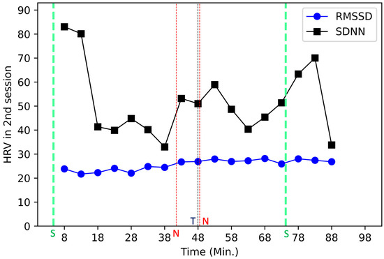 Each 5 min SDNN and RMSSD in the second session. The 3 min data from the session start are omitted as part of the stabilizing time. The “S” marks are the stabilization techniques. The “N” marks are the negative emotion changing abruptly. The “T” mark is the trauma self-narrating.