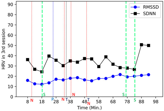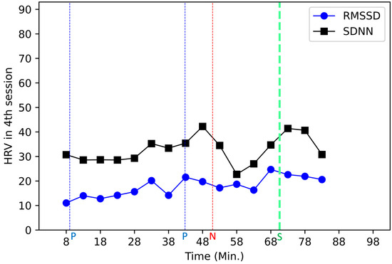 Each 5 min SDNN and RMSSD in the fourth session. The 3 min data from the session start are omitted as being part of the stabilization period. The “P” marks are the positive emotion changing abruptly. The “N” mark is the negative emotion changing abruptly. The “S” mark is the stabilization technique.