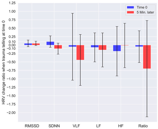 The change ratio of the HRV was assessed as well to check the subject’s current state. The RMSSD and SDNN in this investigation were calculated using the measured heartbeat intervals for the latest five minutes. The RMSSD at minute 18 was calculated using the recorded heartbeat intervals from minute 13 to minute 18. If the subject started to self-report his traumatic event at minute 14, it could affect the HRV factors at minute 18 or minute 23. To calculate the change ratio of the HRV factors, the difference between the former five-minute HRV factors to the present five-minute HRV factors was divided by the present five-minute HRV factors. To check the effect of trauma telling at minute 14, the change ratio from the HRV factors at minute 13 to the HRV factors at minute 18 was calculated and noted as “Time 0”. To track the slow effect of trauma telling at minute 14, the change ratio from the HRV factors at minute 18 to the HRV factors at minute 23 was computed and noted as “5 Min. later”.