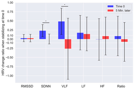Change ratio of the HRV when the stabilizing technique was performed at time 0. Over the 4 sessions, the stabilizing technique was used 10 times. The “*” mark indicates that the p value is under 0.05.