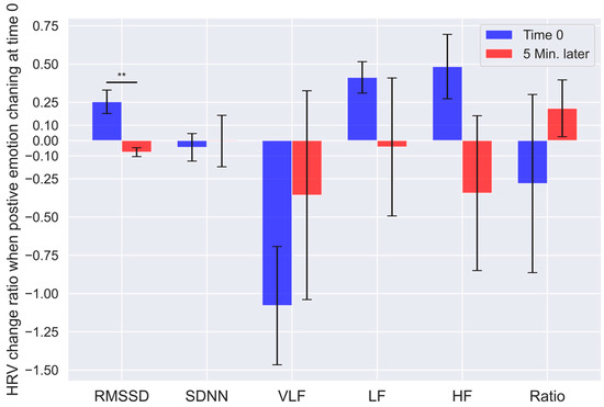 Change ratio of the HRV when the subject’s positive emotion change was observed at time 0. Over the 4 sessions, positive emotion change was observed 3 times. The “**” mark indicates that the p value is between 0.001 and 0.05.