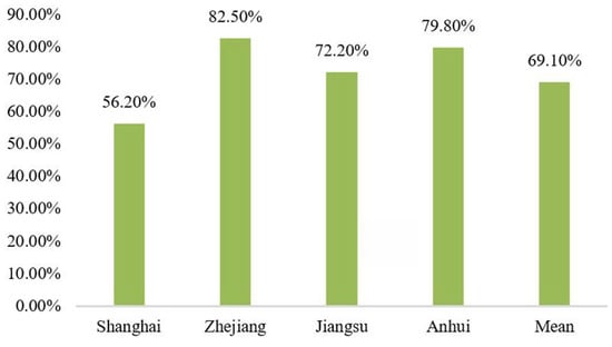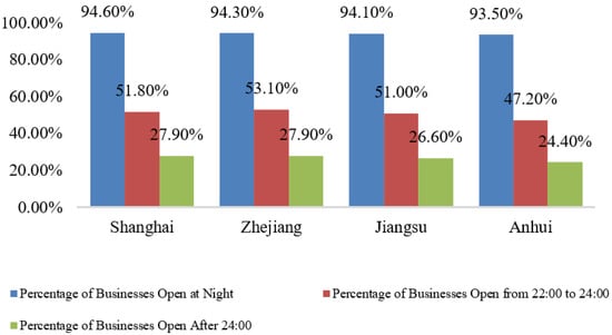According to the percentage of nighttime merchants in the YRD region in 2019 (Figure 1), Shanghai had the highest proportion of nighttime merchants (94.6%), followed by Zhejiang Province (94.3%). According to the compound growth rate of the nighttime transaction number of new business types in the YRD region (Figure 2), Zhejiang Province ranked first among the three provinces and one municipality (82.5%), followed by Anhui Province (79.8%). Jiangsu Province ranked third at 72.2%, whereas Shanghai ranked fourth at 56.2%.