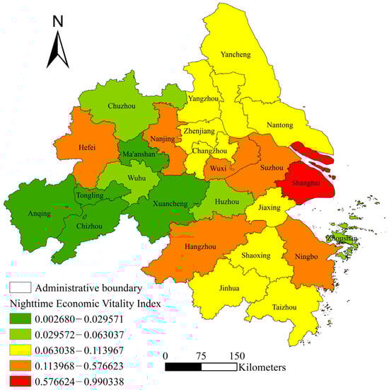 We classified the NEVI of the YRD urban agglomeration for 2020 using the natural discontinuity method, as shown in Figure 3, which indicates that nighttime human activity in Shanghai is more active; the NEVI is the highest there. Hefei, Nanjing, Wuxi, Suzhou, Hangzhou, Ningbo, and Hangzhou fall under the second category; the NEVI is between 0.1141 and 0.5766. Yancheng, Yangzhou, Taizhou, Nantong, Zhenjiang, Changzhou, Jiaxing, Shaoxing, Taizhou, and Jinhua belong to the third category; the NEVI is between 0.0631 and 0.1140. Chuzhou, Wuhu, Huzhou, and Zhoushan comprise the fourth category; the NEVI is between 0.0297 and 0.0630. Anqing, Tongling, Ma’anshan, Xuancheng, and Chizhou fall under the fifth category; the NEVI is between 0.0027 and 0.0296. In general, the level of nighttime economic growth in municipalities directly under the central government, eastern coastal cities, and provincial capital cities is higher than that of other regions. Shanghai’s level of nighttime economic growth is higher than that of Zhejiang and Jiangsu provinces, and the levels of Zhejiang and Jiangsu Province are higher than that of Anhui Province.