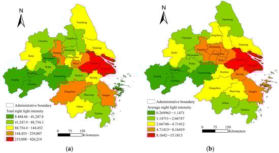 Spatial distribution of nighttime lights in 2020. (a) Total NTL intensity. (b) Average NTL intensity.
