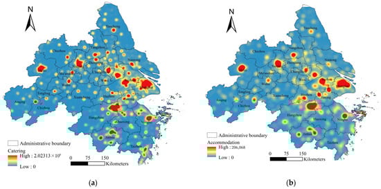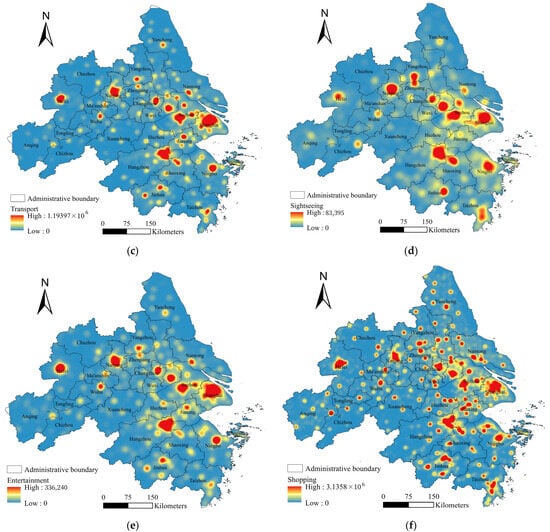 Second, the spatial imbalance between the different cities is prominent. According to the nuclear density analysis (Figure 5), the spatial distribution of NSFs in different cities is considerably different and uneven, showing the spatial distribution features of many dense NSFs in the east, whereas there are far fewer and more dispersed NSFs in the west. In addition, we can see the distribution pattern of one core area and multiple sub-core areas, with the center spreading to the edges. Shanghai’s core area has a dense population and is experiencing rapid economic growth. When establishing an NTE, a city concentrates on building a nighttime economic system that integrates six types of NSFs: catering, accommodations, transportation, sightseeing, entertainment, and shopping. It has established a good business network and a solid nighttime consumer base. The sub-core areas consist of various provincial capitals, including Hefei, Nanjing, and Hangzhou. The levels of economic growth in these cities and in Shanghai differ substantially. Despite this, they are sub-core regions in the YRD urban agglomeration, second only to Shanghai in terms of economic potential, nighttime consumer resources, and adequate NSFs. The characteristics of the spatial distribution of small-core areas are closely linked to NSF type. In small core regions, catering and shopping services are more dependent on spatial distribution, whereas sightseeing and entertainment facilities are less distributed.