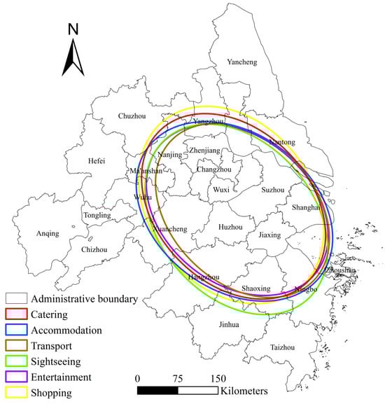 Third, the northwest–southeast diffusion is significant. Standard deviational ellipse analysis can be used to describe the spatial distribution of NSFs in the YRD urban agglomeration as well as their direction of development. The dispersion and concentration of NSFs can be described by the size and shape of the ellipse. The major and minor axes of the standard deviational ellipse represent the direction of diffusion and the degree of concentration of NSFs, respectively. The shorter the minor axis, the more obvious the centripetal force of the data. The more concentrated the future distribution of NSFs and the longer the long axis, the greater the diffusion of NSFs. The azimuth angle of the standard deviational ellipse denotes the direction of distribution of NSFs. From the perspective of the distribution range (Figure 6), the standard deviational ellipse, which comprises 68% of the data, covers the cities of Nanjing, Zhenjiang, Changzhou, Wuxi, Suzhou, Shanghai, Huzhou, Jiaxing, and Shaoxing. There is no major difference in the coverage of NSFs between the different types of businesses. From the viewpoint of directionality and centripetal force, the general development pattern of NSFs in the urban agglomeration of the YRD is such that NSFs are spread along the northwest–southeast direction. There is no significant difference in the directionality or centripetal force of NSFs between the different types of businesses.